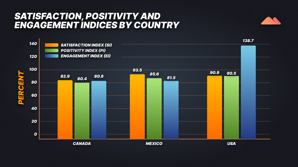 - Mexico has the highest Satisfaction (93.5%), indicating high acceptance of the product and a high level of aspirational enthusiasm.