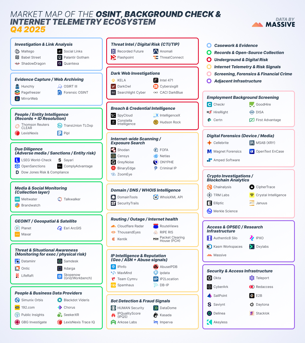 This market map breaks down the major players across 17 distinct categories—from investigation workbenches and dark web monitoring to internet-wide scanning and blockchain analytics. Whether you're a security analyst researching potential threats, a compliance officer conducting due diligence, or a fraud investigator tracking down bad actors, understanding this landscape helps you choose the right tools for your specific use case.