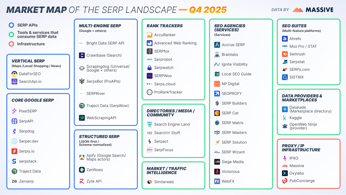 This guide maps the complete SERP API landscape, organizing providers by their core function and technical approach. We'll examine the infrastructure layer that powers SERP data collection, the API providers that deliver structured data, and the tools and services that transform raw SERP data into actionable insights.