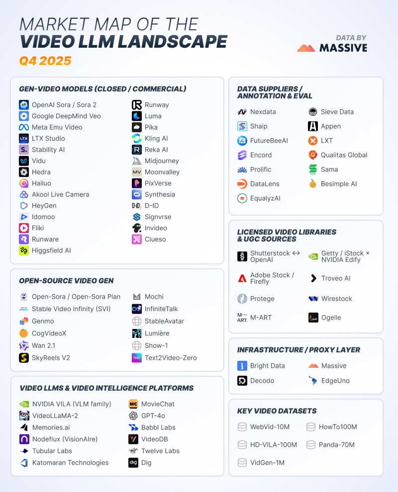 These categories don't operate in isolation. Commercial video generation companies license content from stock libraries, train on public datasets, use annotation services to evaluate outputs, and rely on proxy infrastructure to collect global training data. Open-source projects build on public datasets and may eventually influence commercial products. Video intelligence platforms analyze content generated by creation models, creating feedback loops that improve both understanding and generation.