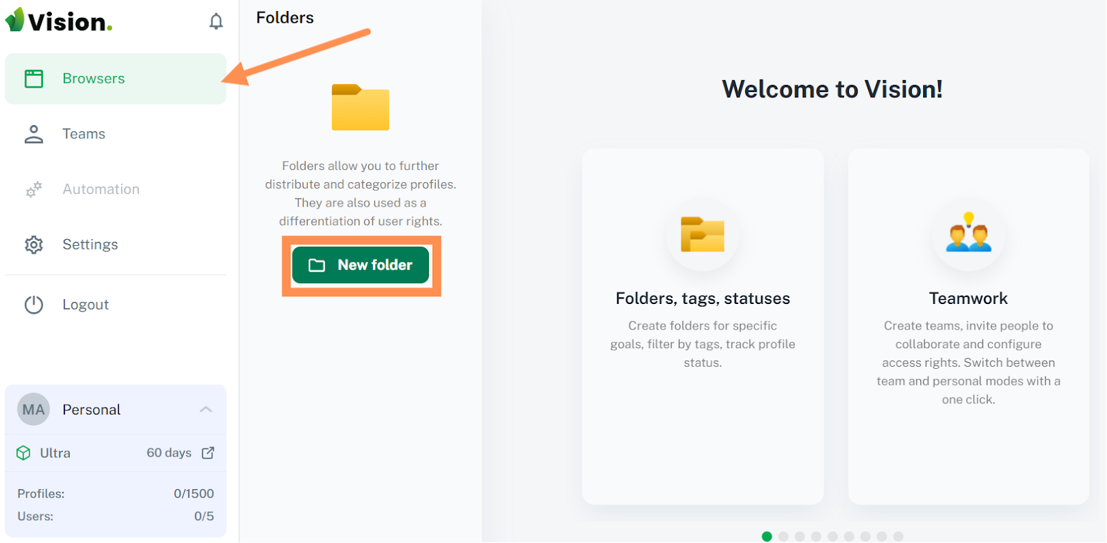 Install the app on your device and launch it. From the sidebar, go to Browsers and select New Folder.