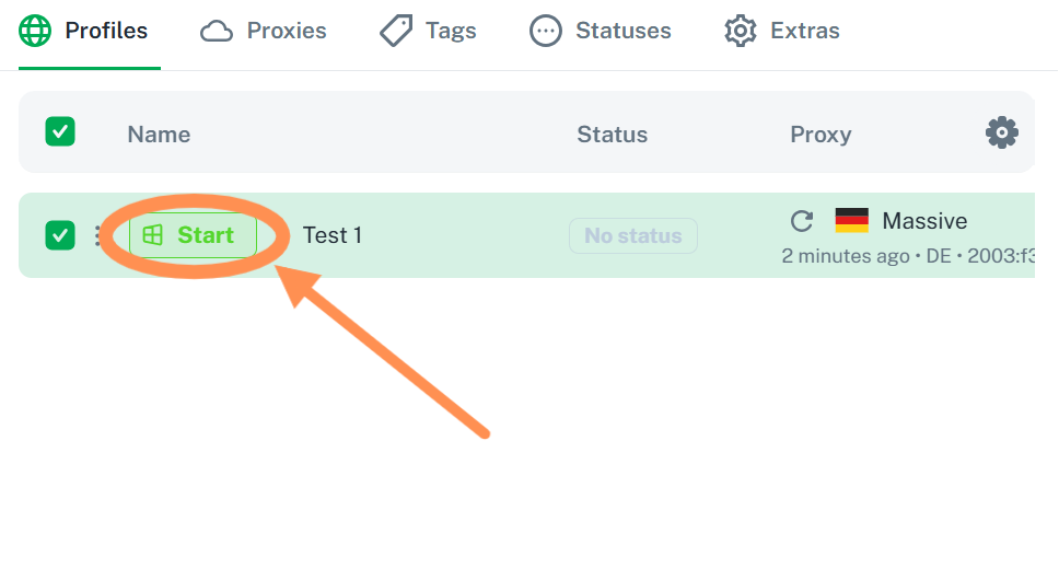 Your new profile will now appear in the Vision dashboard. Click Start to activate it. The setup is complete—Massive Proxies are ready to use in Vision.