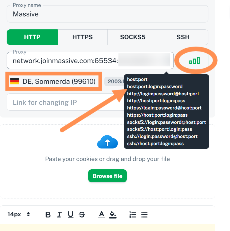 Enter your proxy details using one of the supported formats shown in the screenshot, e.g. host:port:login:password.