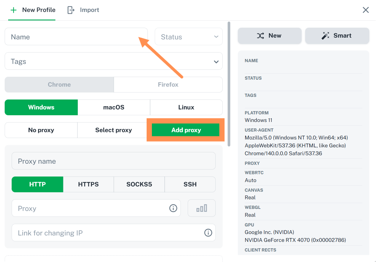 You are now ready to create your first profile. Click the Create Profile button in the top-right corner, enter a name, select your operating system (Windows, macOS, or Linux), and then click Add Proxy.